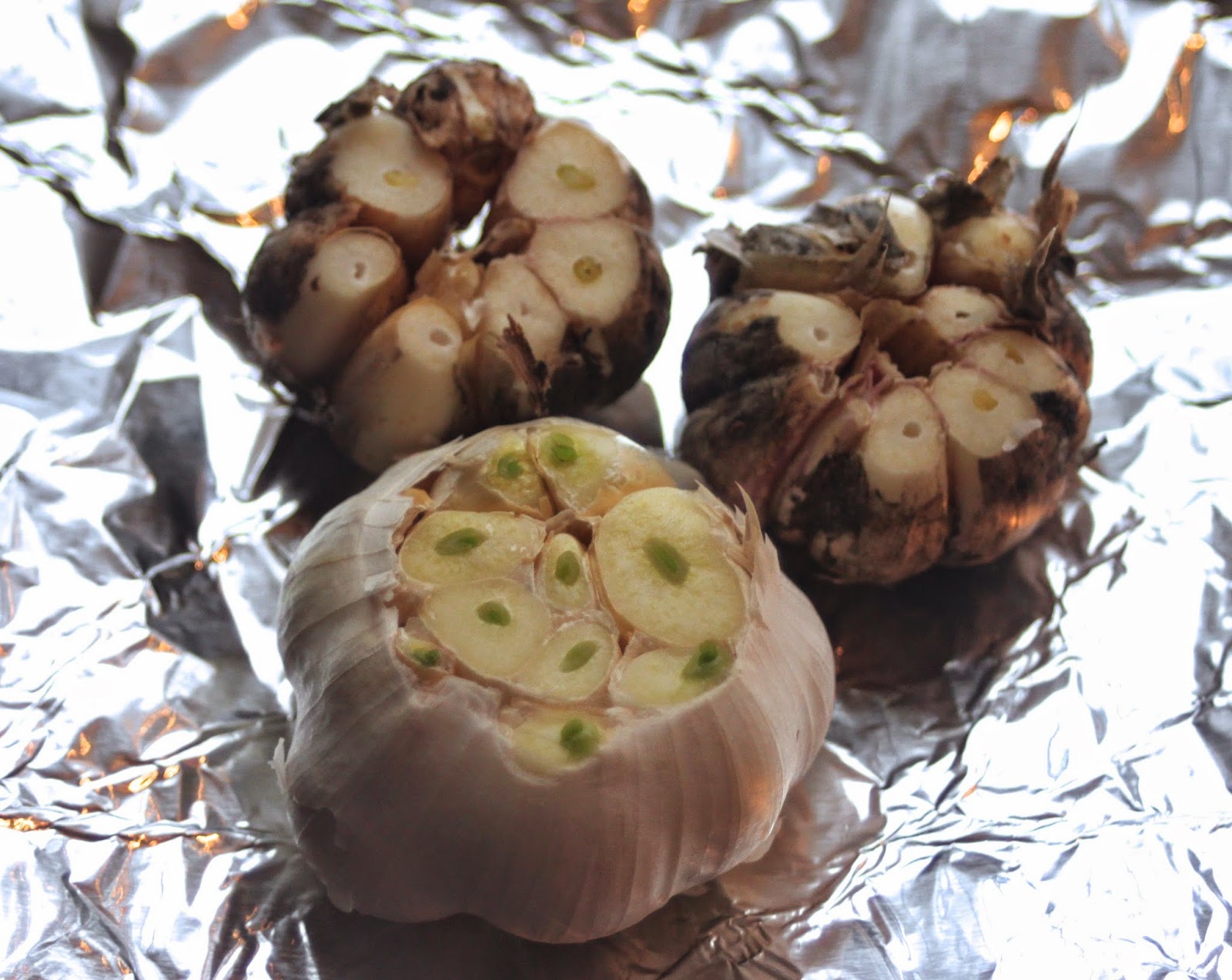 - Cut the tops of the garlic heads off, placing in tin foil and making a little packet.